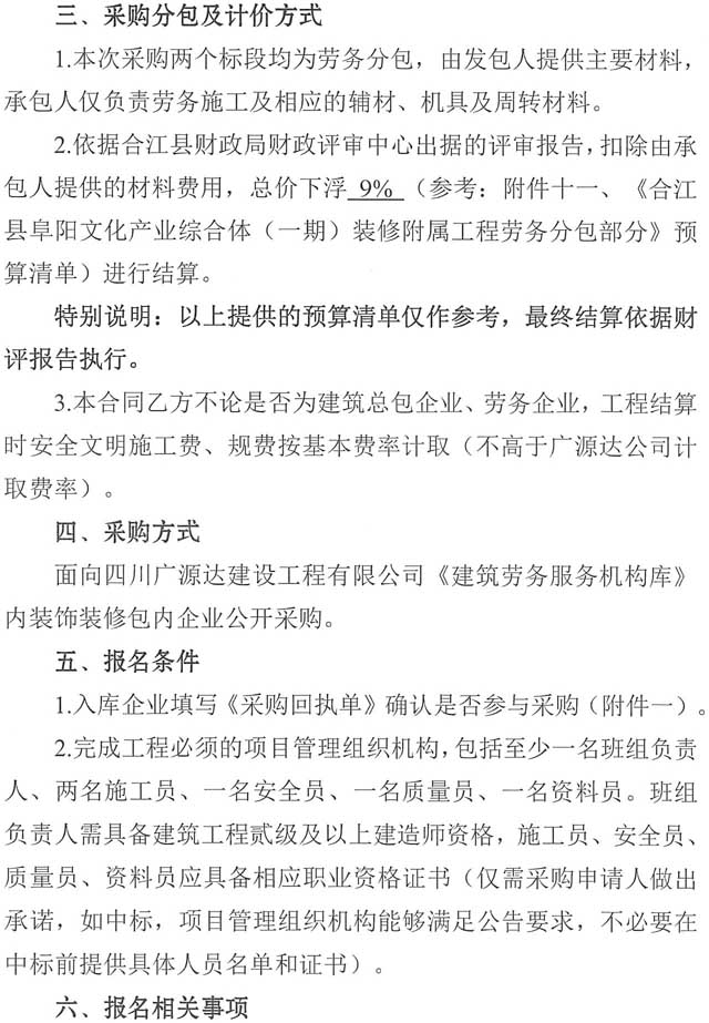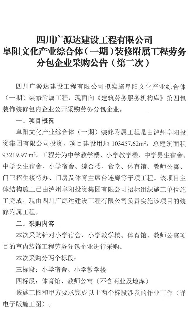 采購公告:四川廣源達建設工程有限公司阜陽文化產業(yè)綜合體(一期)裝修附屬工程勞務分包企業(yè)采購公告(第二次)